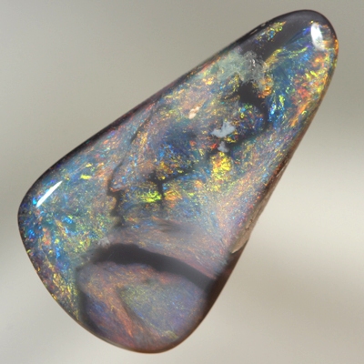This magnificent opal has an enchanting fire display of bright fire red, copper orange, yellow, lime green and turquoise blue. The colours move gently across the face of the opal showing gorgeous and very vivid colour from all angles. The colour never leaves the face and shows a unique picture of gem opal and black opal.